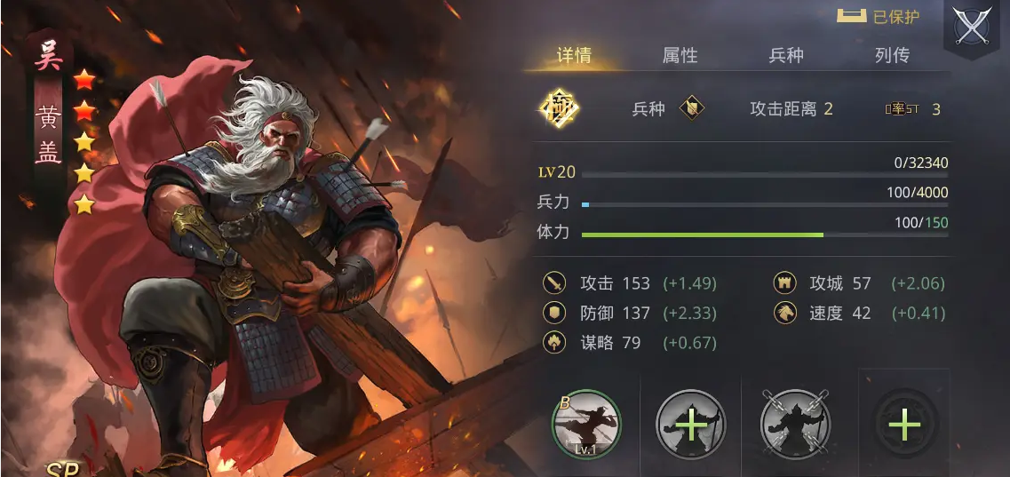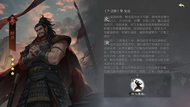 韩当作为吴国四星弓将,凭借均衡的攻防属性与特殊战法机制,成为性价比极高的过渡型武将。其初始82攻击、76防御、73谋略的三维属性,在四星将中属于中上水准,尤其适合前期开荒与中期次级队伍组建。该武将的核心价值在于自带战法经久善战,能为我军群体提供持续2回合的防御加成,配合特定阵容可显著降低战损。需韩当的速度属性仅46点,在弓兵中属于较低水平,这要求玩家在搭配时必须考虑出手顺序的战术安排。