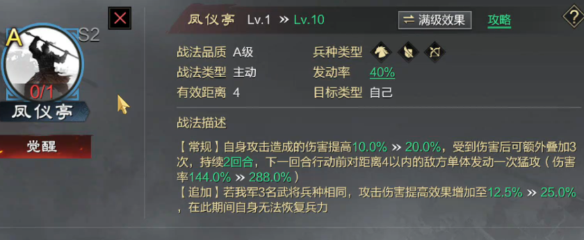 兀突骨的自带战法藤甲突击是触发其核心机制的关键。该战法为被动类型,优先级最高,确保兀突骨不受敌方指挥战法影响,包括白衣渡江、反计之策、无心恋战等控制或减益效果。战法的触发条件为每回合首次发动主动战法后,对距离4以内的敌军群体造成一次100%伤害率的物理攻击,并降低其下一次攻击或策略攻击50%伤害。这一效果要求兀突骨必须携带高发动率的主动战法,例如闪击(50%发动率),才能稳定触发后续群体伤害与减益。
