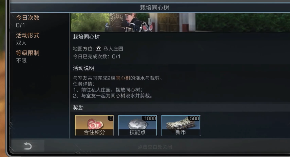 种好同心树,首先得和好友完成合居。合居成功后,系统会自动送你们一棵专属的同心树,这棵树可不是普通的植物,而是属于建筑类物品,需要两个人一起培养。庄园主负责每天浇水,室友则负责修剪,每天只能互动一次,记得在凌晨3点刷新前完成哦。