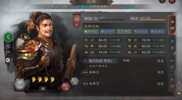 李严在三国志战略版中的核心定位是内政官,尤其适合担任木材官或冶铁官。其自带战法枝叶扶苏能显著提升木材产量,满级后可增加2%的收益,这一特性使其成为资源管理体系中不可忽视的武将。从属性来看,李严的政治值较高,适合通过政治加点进一步强化其内政效果,而其他属性如武力、统率等表现平庸,不适合作为军事将领培养。