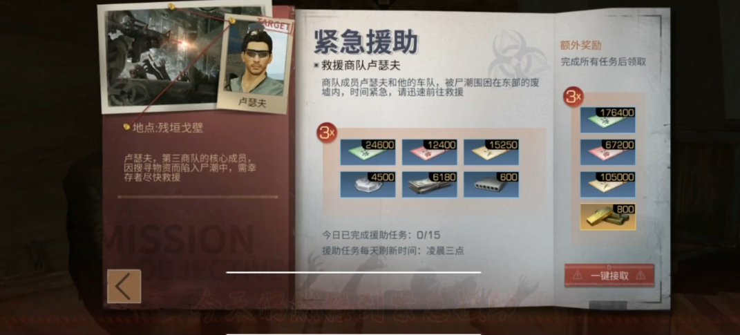 紧急援助任务是明日之后中一种高收益的限时任务,幸存者在接取普通援助任务时有概率触发。该任务要求玩家在5分钟内完成,否则视为失败,奖励包括三倍执勤点、金条及高额熟练度。任务通常涉及救援被感染者围攻的NPC或清理大规模感染者潮,因此需提前准备高爆发武器和充足弹药。