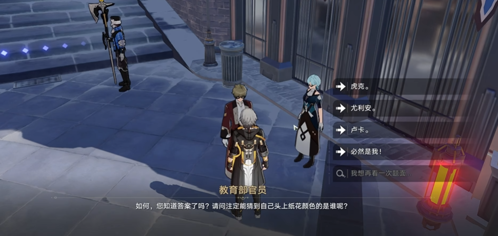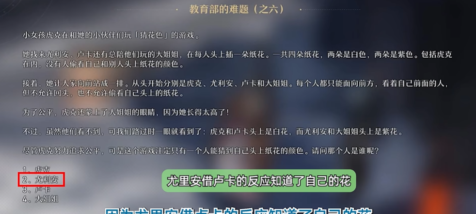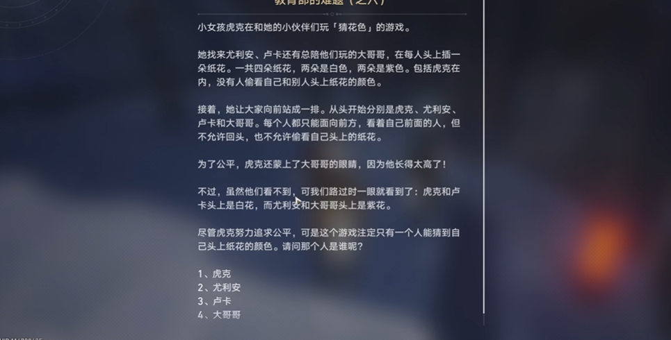 崩坏星穹铁道教育部谜题6的答案是尤利安。这道题属于猜花色的逻辑推理题,咱们需要从四个人的站位和互动中找出唯一能确定自己头上纸花颜色的小伙伴。具体场景是虎克、尤利安、卢卡和大姐姐排成一列,每人头上戴着白色或紫色的纸花(共两白两紫),但只有尤利安能通过逻辑推演出自己的花色。