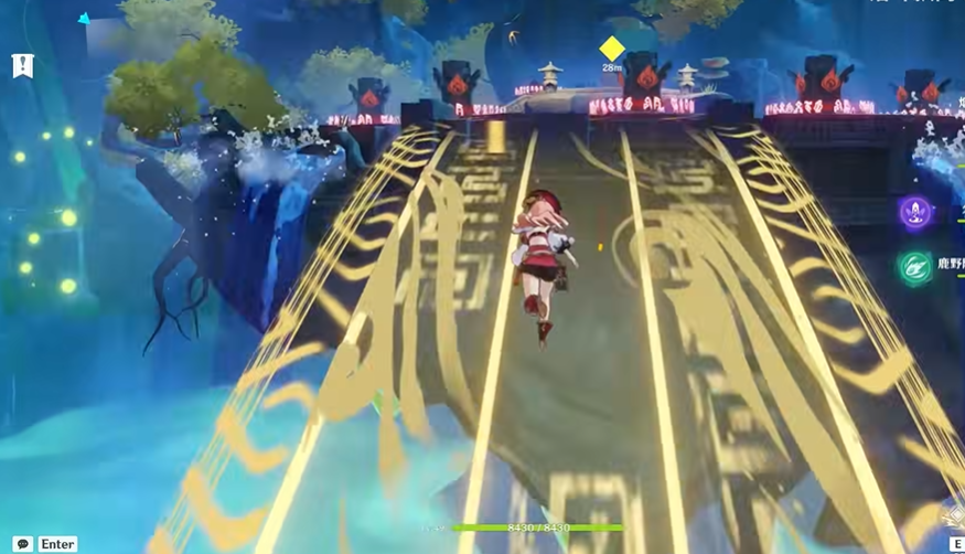 打完史莱姆来到平台机关处,这里需要逆时针旋转90度让光桥连接到下一个平台。过去后会遇到几个丘丘人,击败它们后这边的方形石柱就可以顺时针旋转了。接下来能看到五个火元素方碑和三个被锁住的宝箱,需要完成三次限时点亮方碑的挑战,每次成功就能开一个宝箱。三次都完成后对面风场会自动开启,这时候可以借助风场飞到上层平台。