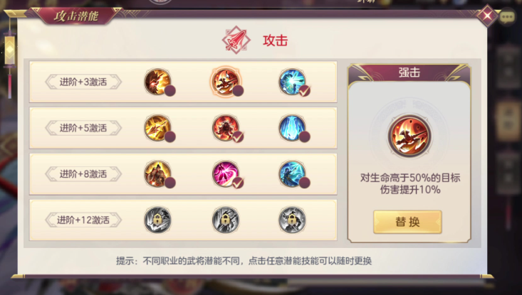 潜能加点建议选择战意勃发或连携加护战魂。具体加点顺序为:+3振奋提高生存能力;+5应援对低血量队友提升治疗量;+8奋迅加速自身怒气回复;+12抵抗提高异常状态抗性。这种加点方式能充分发挥步练师的持续治疗能力,同时保证其生存和功能性。在战斗中应优先释放步练师绝技,注意保持队伍血线健康,合理利用治疗技能进行恢复。