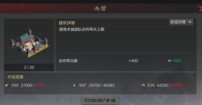 兵营系统的建设与升级是兵力提升的另一关键。当城主府达到7级后即可建造兵营,此后每提升1级兵营等级,单个武将的带兵上限将增加200。兵营等级越高,带来的兵力增幅越显著,尤其在游戏后期,高级兵营对总兵力的提升效果远超武将等级。需兵营升级消耗的资源较多,建议优先保证主城核心建筑的升级需求,再逐步投入资源提升兵营等级。
