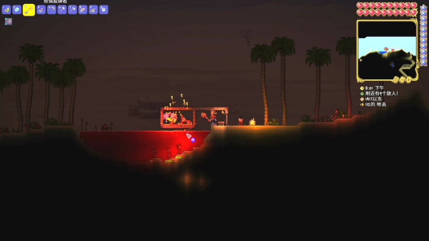 生命水晶一定要优先收集,它能提升血量上限,但注意血量超过120后可能触发血月事件。金币存进箱子或猪猪存钱罐,死亡时不会掉落。遇到沙漠就砍仙人掌做剑,比木剑好用得多。哥布林入侵事件来临时,找个开阔场地用迷你鲨配合陨石子弹能轻松解决,打赢后记得找哥布林商人重铸装备属性。
