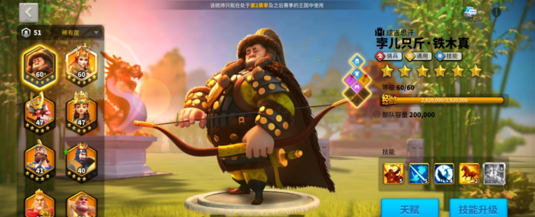AOE(范围伤害)武将的选择对于野战和集结至关重要。K2阶段可用的AOE武将主要包括李成桂、铁木真、爱德华、武则天和亚历山大。这些武将的技能设计让他们在群体战斗中表现突出,能够同时对多个目标造成可观的伤害。李成桂的主动技能可以对扇形范围内的敌人造成高额伤害,而铁木真的骑兵突击技能则能对前方敌人形成持续压制。爱德华和武则天的技能同样具备优秀的范围伤害能力,亚历山大的觉醒技能还能提升周围友军的输出效果。