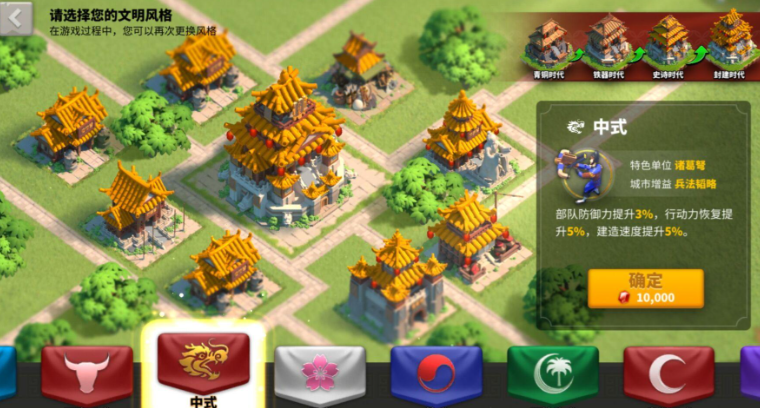 中式文明以其建造速度和防御加成成为新手和平民玩家的首选。其核心增益包括部队防御力提升3%、行动力恢复提升5%以及建造速度提升5%。这些属性在游戏前期能显著缩短发展周期,尤其适合快速积累资源与提升建筑等级。建造速度的优势让玩家能更快解锁关键功能,例如市政厅升级带来的队列扩展和科技研究加速,从而在竞争激烈的服务器中占据先机。
