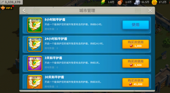 保护罩(和平护盾)是保护玩家城市免受攻击的核心防御机制。开启保护罩的主要方式是通过主动使用道具和平护盾,该道具分为绿、蓝、紫、橙四种品质,品质越高,持续时间越长。道具可通过VIP商店消耗宝石购买,或通过联盟积分兑换。需保护罩仅对城内部队生效,野外采集或攻击野蛮人的部队仍可能遭受攻击。