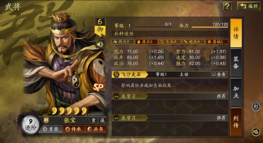 张宝的沉沙决水提供沙暴状态,触发张角五雷轰顶的额外震慑效果,同时张梁的落凤和纵兵劫掠补充硬控,形成输出与控制闭环。张角的太平道法提升自带战法发动率,士别三日增强生存与爆发;张宝的御敌屏障降低团队战损,而张梁的武力输出能有效针对低统率目标。需注意张宝和张梁的兵种适性较低,优先选择盾兵或枪兵以规避兵种克制。