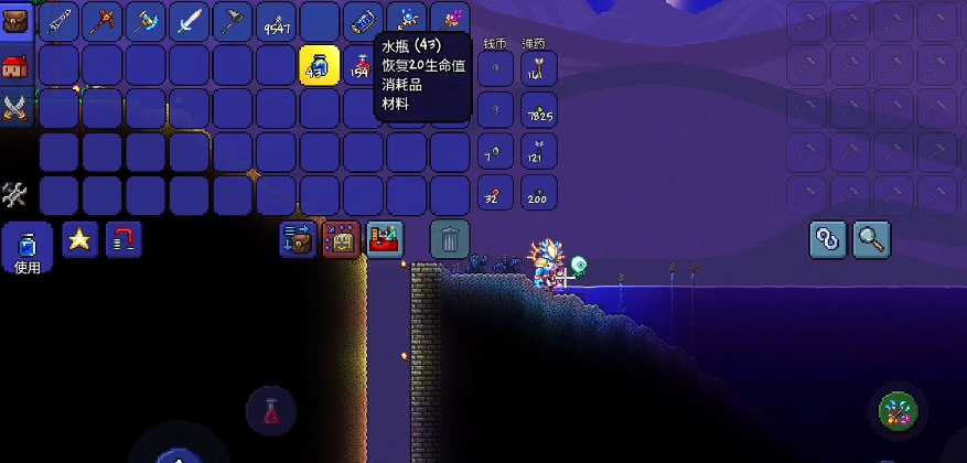 解除老人诅咒后进入地牢,两侧平台上的蓝色药瓶即为弱效魔力药水,使用工具击落后可直接拾取。该方式需注意地牢守卫的威胁,建议装备足够防御后再尝试。困难模式前在地下发光蘑菇生物群落寻找迷失女孩(宁芙)也有概率掉落金属探测器,虽非直接获取蓝瓶,但能提升后续材料收集效率。