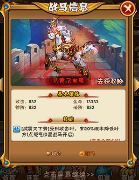 除了赤兔马,爪黄飞电也是关羽的备选战马之一。这款战马注重攻防平衡,属性加成集中在攻击力和防御力上,适合需要持久作战的场合。爪黄飞电的耐力优势能让关羽在长时间战斗中保持稳定输出,尤其适合对抗高防御阵容。虽然速度加成不如赤兔马突出,但其综合属性更适合面对消耗型对手,避免因生存能力不足而提前退场。