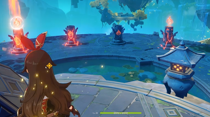 第三个机关是核心解谜环节,需按特定顺序点燃石柱。挑战分为三阶段:45秒内按提示顺序点燃3根石柱,60秒内点燃4根,75秒内点燃5根。每完成一阶段会解锁一个宝箱(普通、精致、珍贵各一个)。全部完成后触发对面岛屿的风场,需逆时针旋转平台返回并利用风场上升至高层区域。此处需注意观察石柱冒火顺序,错误操作会重置挑战进度。
