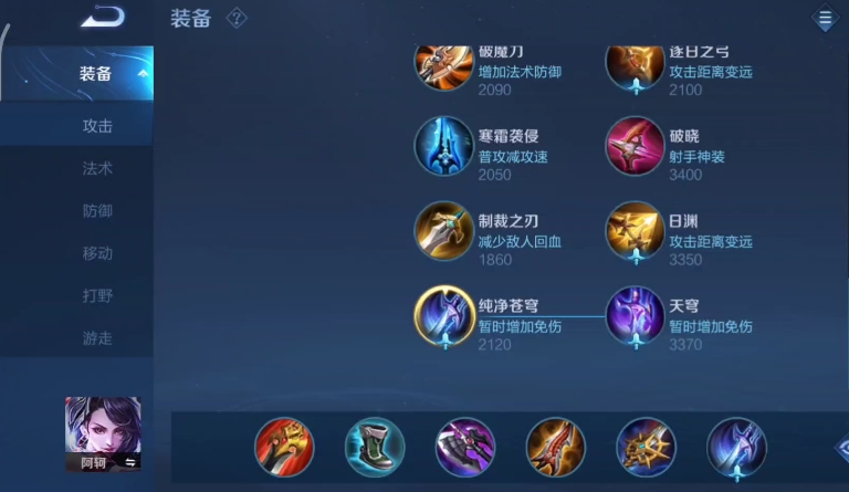 如果游戏进行到中后期,对面的坦克或者战士护甲堆起来了,你就需要考虑出碎星锤(破甲弓)来保证自己的穿透能力,不然打前排会非常吃力。如果对面脆皮多或者你优势很大,想进一步强化收割能力,破军会是更好的选择,它对生命值低于一半的敌人有额外伤害,配合阿珂的收割特性非常厉害。最后一件装备通常是保命装,用来提高团战容错率,名刀司命和贤者的庇护(复活甲)是最常见的选择。名刀可以在关键时刻帮你抵挡一次致命伤害,有时候就是靠着这不到一秒的无敌时间完成反杀或顺利撤退;复活甲则能给你第二条命,让你有再打一套的机会。