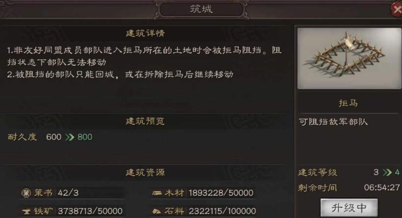 拒马本身没有攻击力,不会主动打人,但它有一个非常霸道的作用,就是能把不是你们同盟的部队硬生生拦住。敌人撞上你的拒马,就只能干两件事:要么花五分钟时间把它拆掉再过去,要么自己乖乖点撤退回城。这五分钟的阻挡时间就是拒马最大的价值,它能强行拖慢敌人的进攻节奏,打乱他们的计划。敌人主力部队被这么一拦,体力也消耗了,进攻的势头也就断了,能给你和你的盟友争取到非常宝贵的反应时间,让你能从容地调主力部队过来驻守,或者组织反击。造拒马的核心目的不是指望它把敌人全干掉,而是用它来争取时间和消耗敌人,是一种战略性的拖延工具。