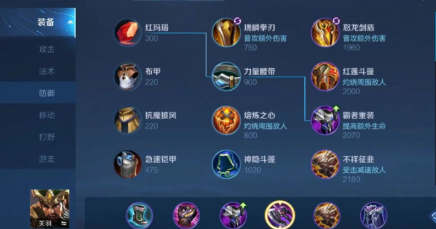 通常会在输出核心装之后补上一到两件防装来保证自己进场后能活着出来。不祥征兆是针对物理伤害的很好选择,尤其是对面射手比较肥的时候,它的减速被动能让追击你的敌人很难受。魔女斗篷则是用来对抗法师的爆发,那个护盾能帮你扛住关键的一波技能。到了大后期,如果格子允许,可以考虑把鞋子换成保命装,比如名刀司命或者贤者的庇护,这样能让你在团战里有第二次进场的机会。暴击流关羽是刺客打法,不是坦克,你的任务是切入和收割,而不是吃第一波伤害。