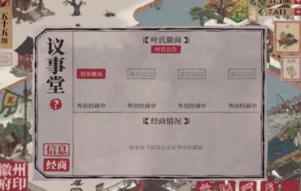 具体的操作是在徽州府中,每个家族都拥有自己的议事堂,你可以在这里招募并委派徽商外出经商,售卖诸如木材、纸张、汪笔等资源。经商过程分为多个档位,所需资源、商人数量和交易时间各不相同,交易完成后除了获得铜钱和家族资金,还会固定增加声望。你需要专注于让一个家族长期经营某一种或两种资源,使其市场占有率逐渐提升,这能更有效地积累声望。