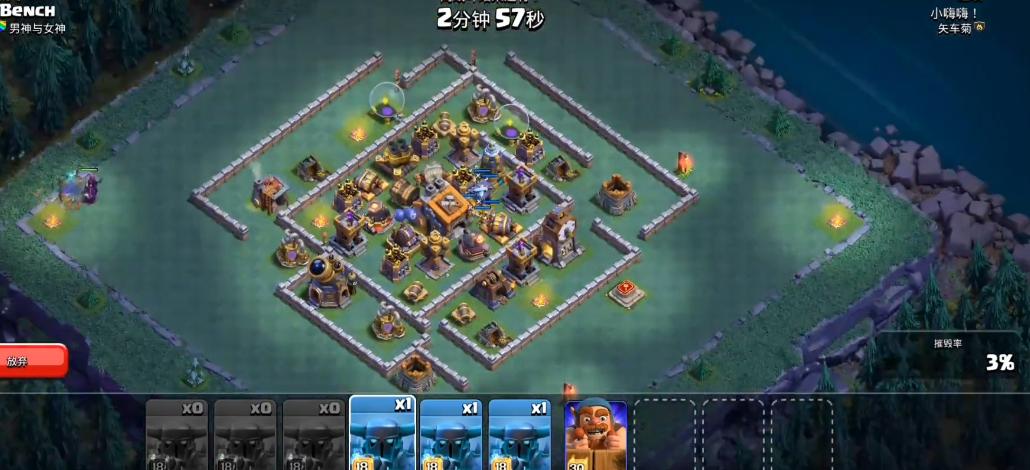 飞盾战神搭配挖挖是当前最优选,飞盾战神本身以快速突进、优先拆除核心防御为核心打法,进场后锁定天鹰火炮、地狱之塔、多头地狱塔等关键建筑,挖挖会同步遁地跟进,在战神攻击目标时触发眩晕,短暂瘫痪高伤防御,大幅降低战神承受的火力压力,避免被核心防御快速集火倒地,面对密集防御阵与回字阵时,控场效果尤为明显,能为战神创造持续输出窗口,配合地震法术与弹跳法术,可快速击穿核心区域,完成前戏破阵与关键建筑清除,为大部队推进扫清障碍。