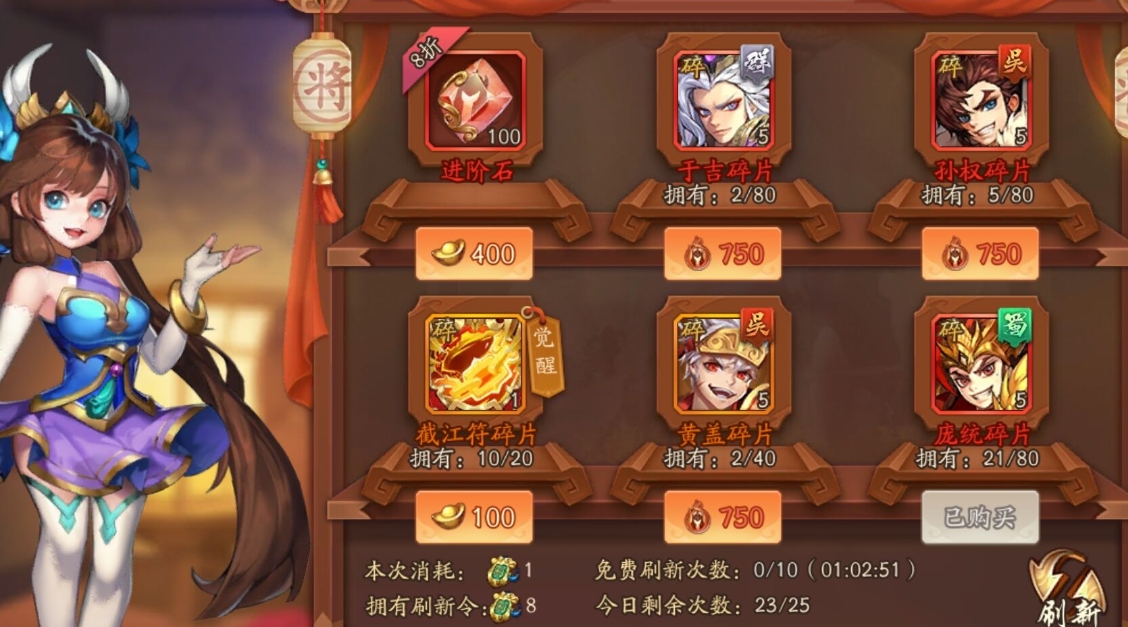 前期以红将为核心构建基础阵容,推进主线副本、日常任务与竞技场玩法,积累元宝、将魂、军团币等基础资源。日常活跃度奖励、七日签到与副本掉落会持续产出红将碎片与基础养成材料,红将满星后可分解获取将魂,为后续金将碎片兑换储备货币。竞技场每日挑战与排名结算可获取竞技币,在竞技商店稳定兑换红将与金将碎片;军团内积极参与军团副本、军团试炼与军团活动,获取军团贡献币,在军团商店定期兑换金将碎片与金色万能碎片,这是平民玩家获取金将碎片的稳定渠道。将魂商店每日刷新,优先兑换金将碎片与金将养成材料,避免将魂浪费在低品质资源上。