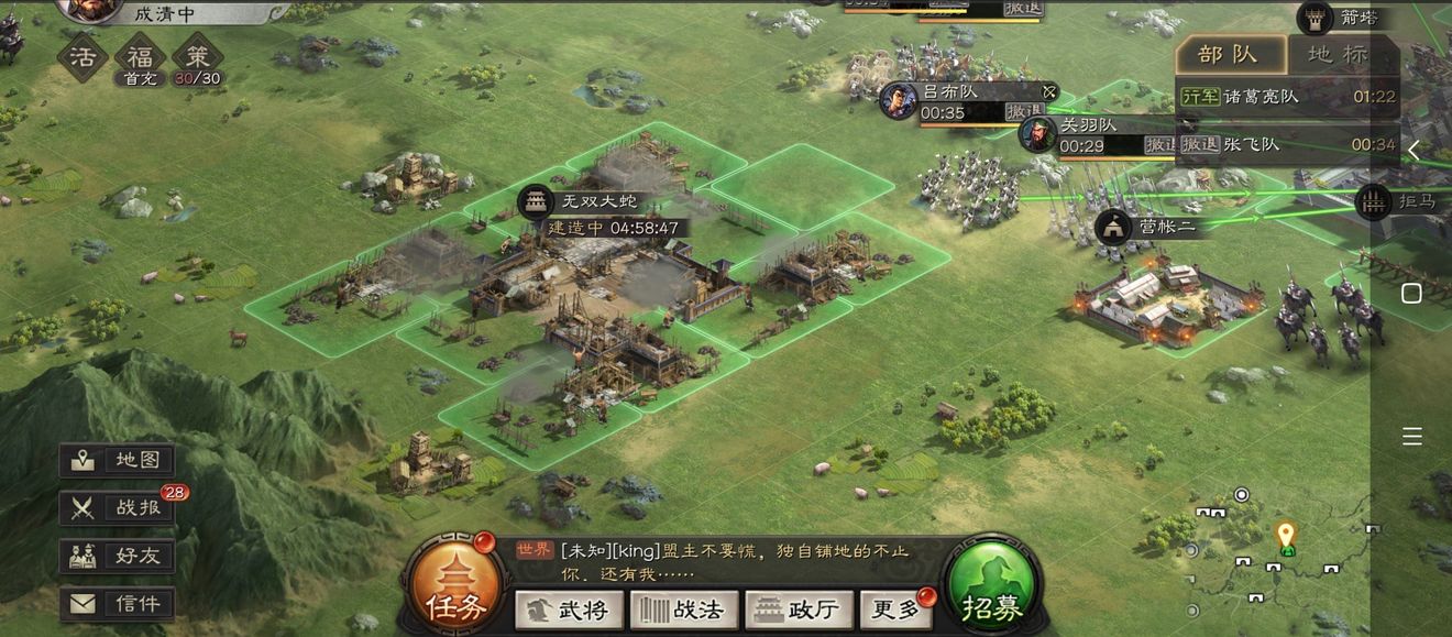 属性加点与兵书选择决定开荒下限,输出武将全部堆武力、智力属性,辅助坦克武将主堆统率,速度微调保证先手行动。突击骑兵兵书选择作战路线,走胜战、执锐提升兵刃伤害,弓兵法系武将点文韬、鬼谋强化谋略输出,辅助武将选择九变兵书,点出援其必攻、励军,提升队伍续航与联动效果。开荒过程学会低损碰瓷玩法,先用少量兵力消耗守军兵力,主力部队再进场收割,合理利用预备兵返还机制,七级主城前专注五级地屯田发育,兵营等级同步提升,循序渐进攻打高级地块,不要盲目越级开地,稳定发育远比快速冲本更加重要。