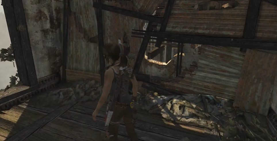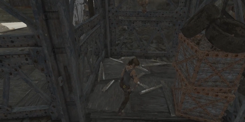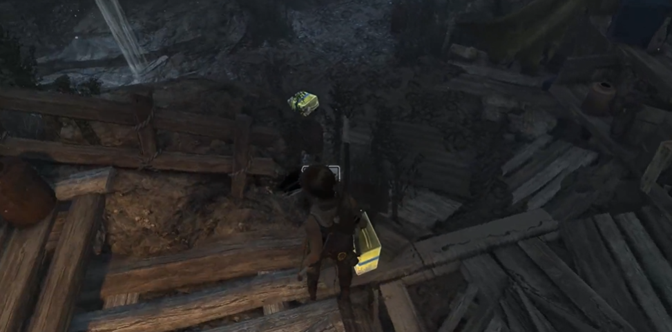 藏宝图所在平台需要特定路线才能到达。从营地停放直升机的山丘出发,沿右边楼梯下去能看到穿衣服的十字架,用火箭烧掉衣服再用绳箭拉倒它。返回初始平台前进入中央铁皮屋拿完遗物后,往东探索断桥,注意北侧桥底挂着的图腾。攀上东侧岩石跃到桥顶横梁,再跳到左边树干平台就能发现藏宝图箱子。